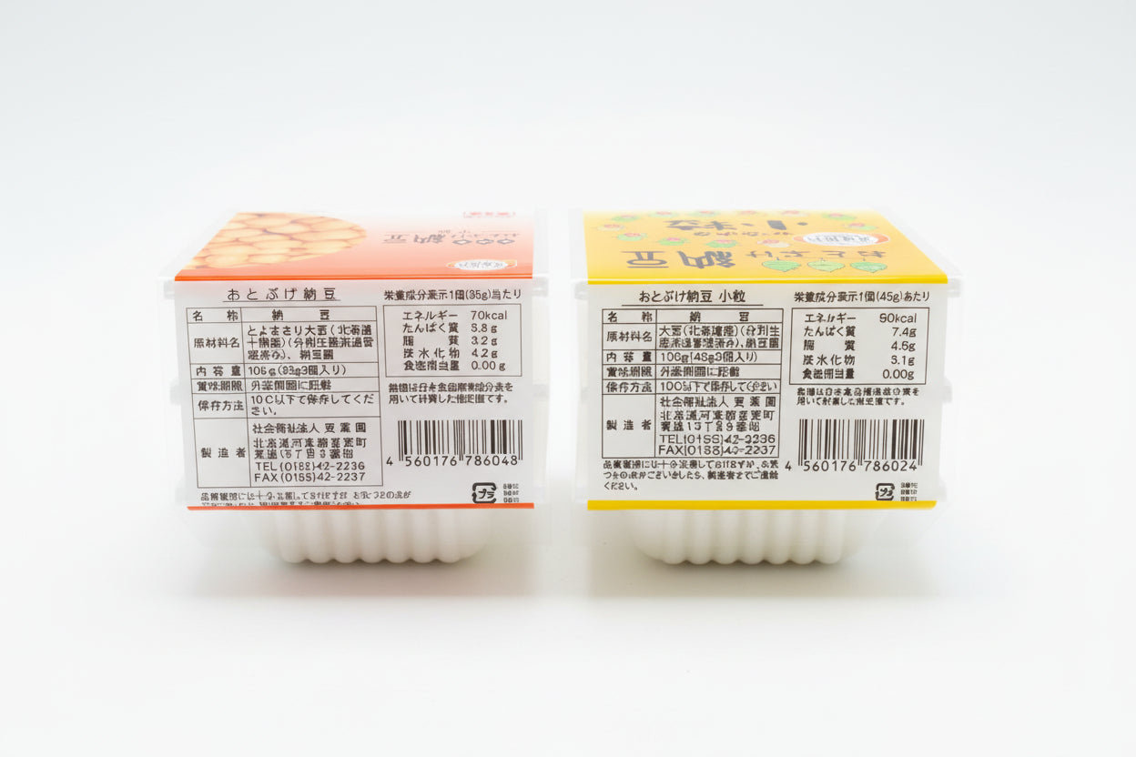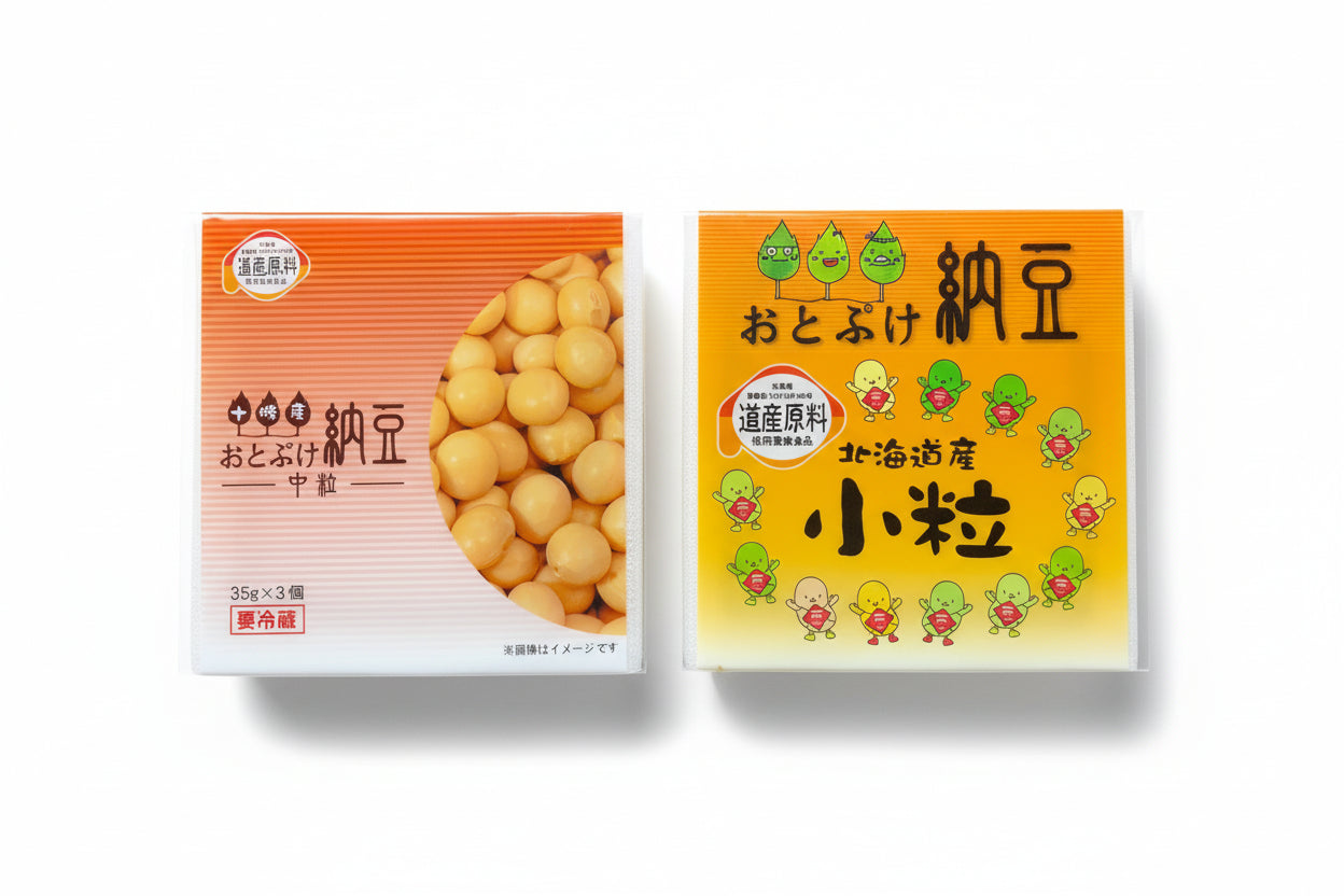 十勝産「とよまさり大豆」を使った中粒タイプと、北海道産「ゆきしずか大豆」を使った小粒タイプの2種類の納豆です。